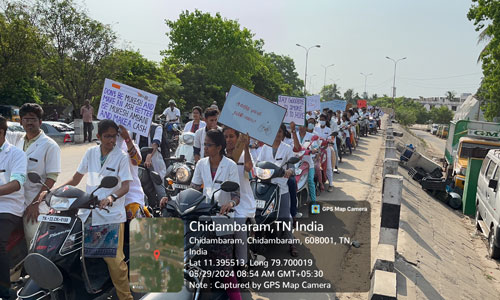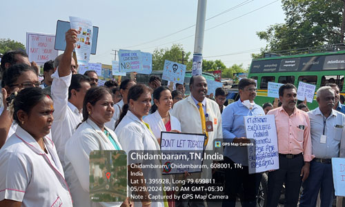 A rally through Chidambaram town, led by the students and faculty of GDC, to raise awareness about the harmful effects of tobacco on No Tobacco Day on 29/05/2024.